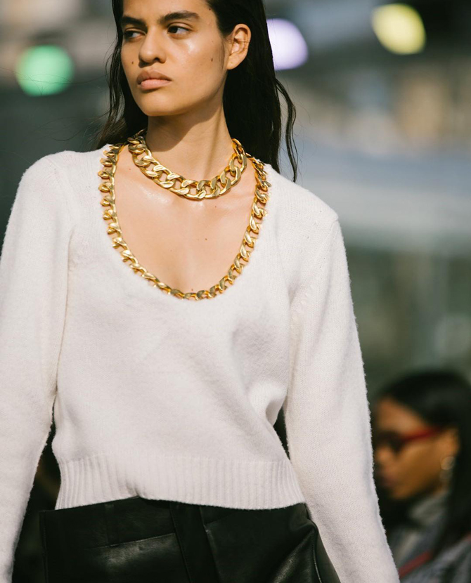 Хэдийгээр гялалзсан нарийн алтан гинж нь сүүлийн улирлуудын турш аксесуарын салбар дахь гол трендээр нэрлэгдэж, бүсгүйчүүдийн хамгаас дуртай гоёл байсаар ирсэн ч загварынхан яг одоо илүү өргөн, хүнд гинжээр гангарч эхлээд байна. Гэхдээ энэ нь нарийн гинжнүүдээ далд хийх хэрэгтэй гэсэн үг огт биш юм. Харин ч нарийн гинжнүүд болон чокер санагдуулам өргөн алтан гинжээ бүгдийг нь давхарлан зүүх нь илүү загварлаг шийдэл байх болно.