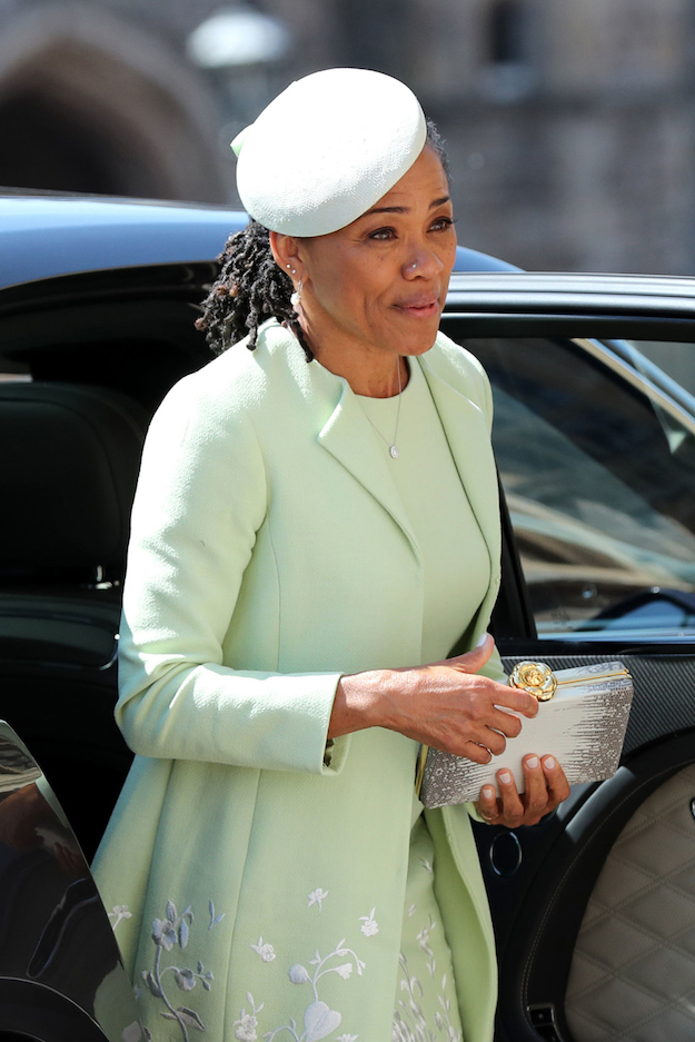 Меган мөн атласан материалтай Givenchy ордны туфли өмсөж, Cartier-ын ээмэг ба бугуйвчаар гоёжээ. Түүний нүүр будалтыг дотнын найз ба мэргэжлийн нүүр хувиргагч Дэниель Мартин хийсэн байна.